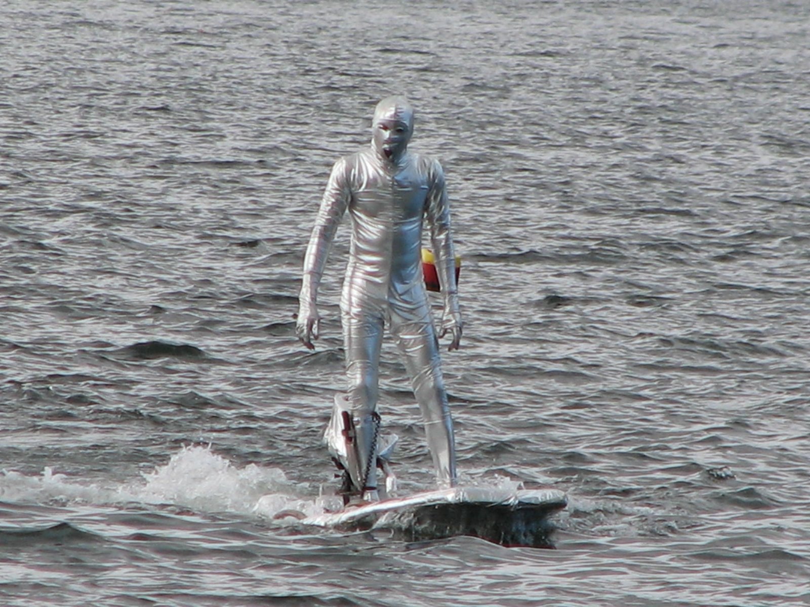 Unfortunately, most of us couldn’t get up early on Sunday morning, so we ended up at the Kayak Centre, paying our TT$25 each, buckling up our life jackets, and sliding the kayaks into the water just after 1pm. It seemed we were keeping similar time to a new fixture on Williams Bay – Trinidad’s “Silver Surfer” (taken, it seems, from the subtitle of the Fantastic Four movie sequel). His attire is a full silver body suit, silver face paint, and a surf or boogey-board covered entirely in aluminium foil and powered by a motor…